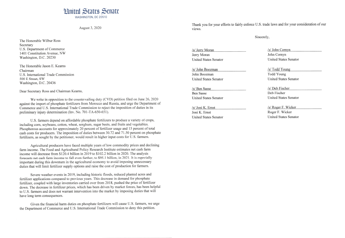 In part, the Senators wrote, “U.S. farmers depend on affordable phosphate fertilizers to produce a variety crops… The imposition of duties of between 30.72 and 71.50 percent on phosphate fertilizers, as sought by the petitioner, would result in higher input costs for U.S. farmers.”